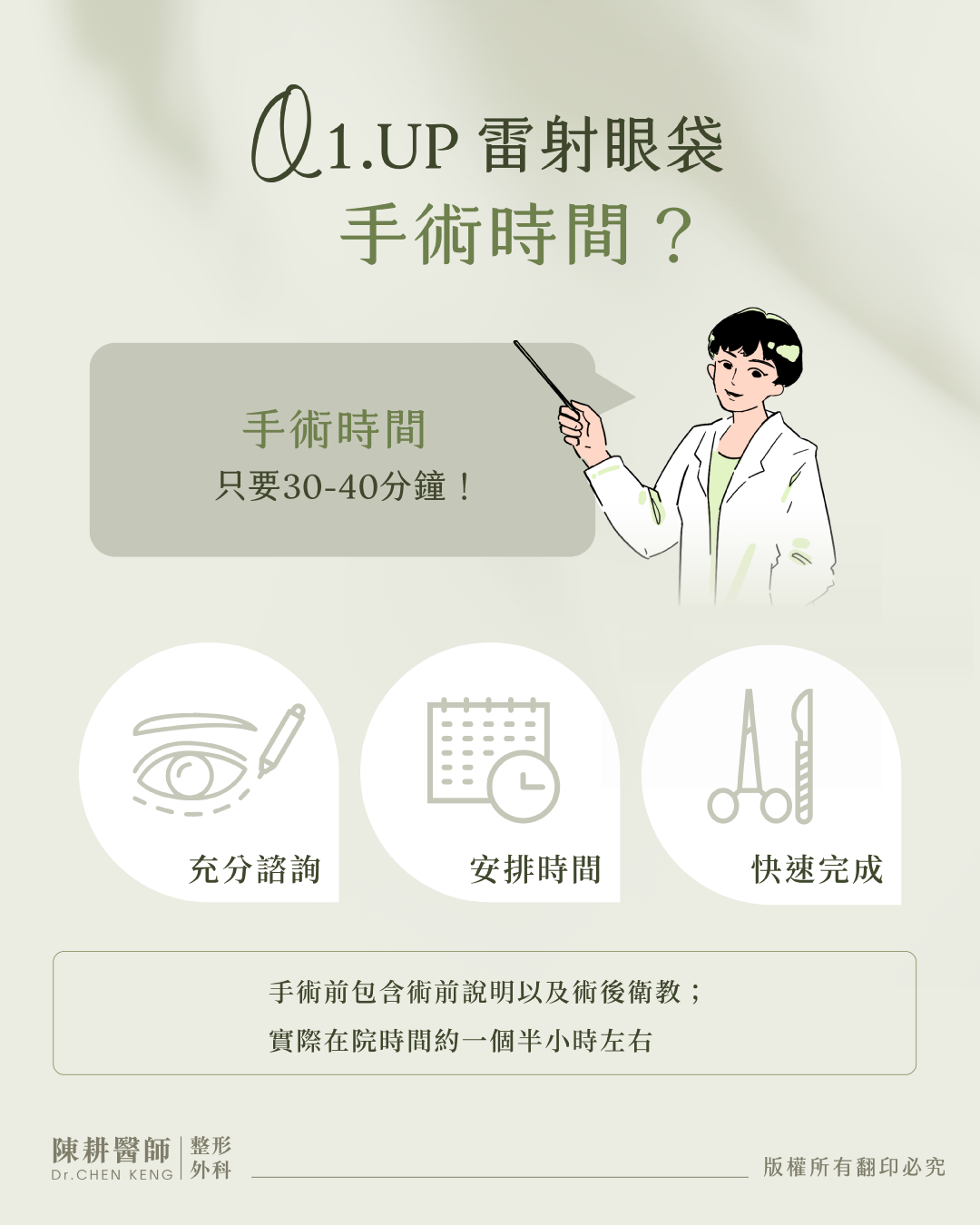 UP雷射眼袋的手術時間大約 30~40分鐘。