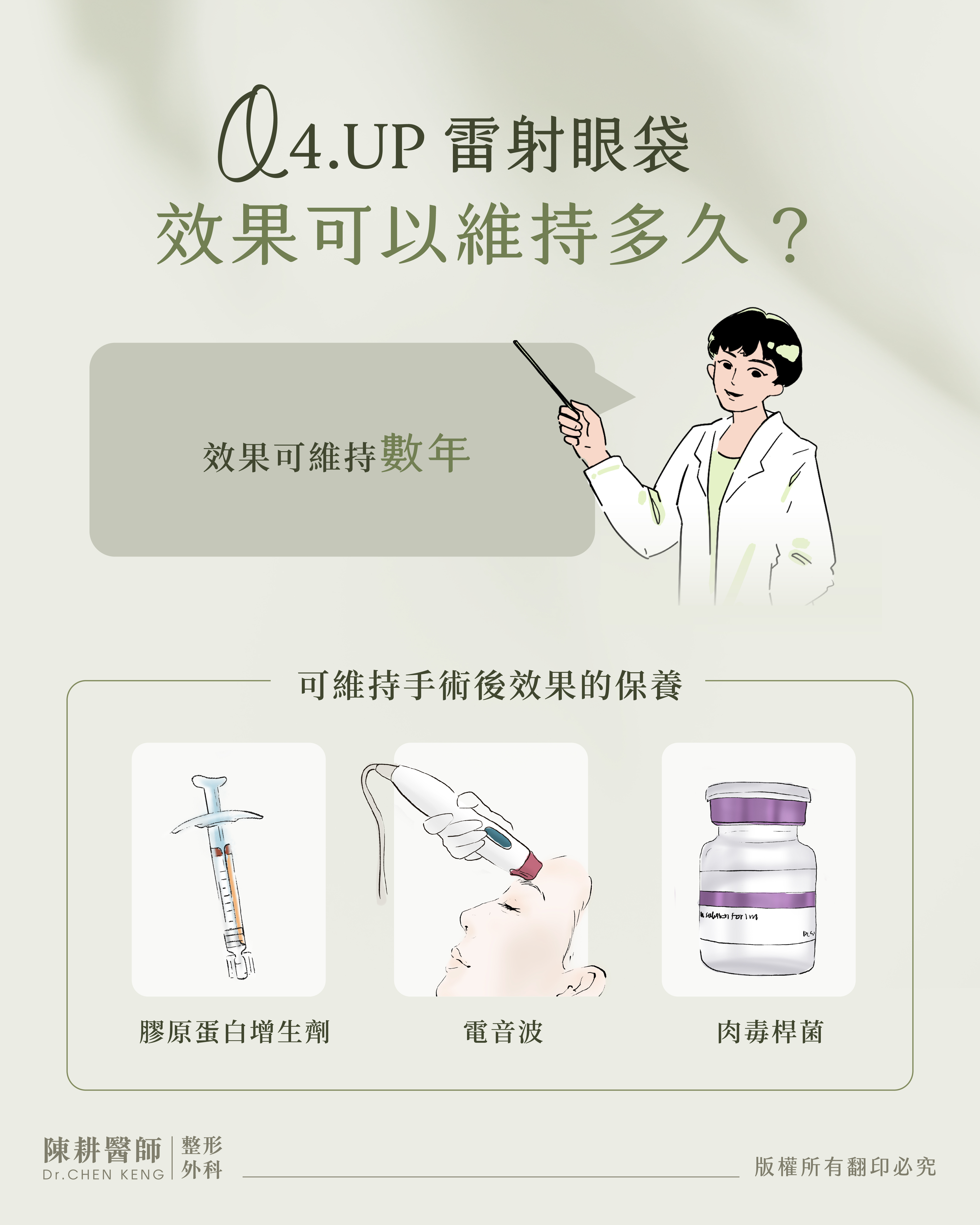 效果通常可維持數年,但仍會因個人膚質、老化速度與生活習慣有所差異。如想要延長手術的效果或是讓術後效果更為加分,可以進一步了解階段性保養,以下介紹常搭配UP雷射眼袋術後療程項目: