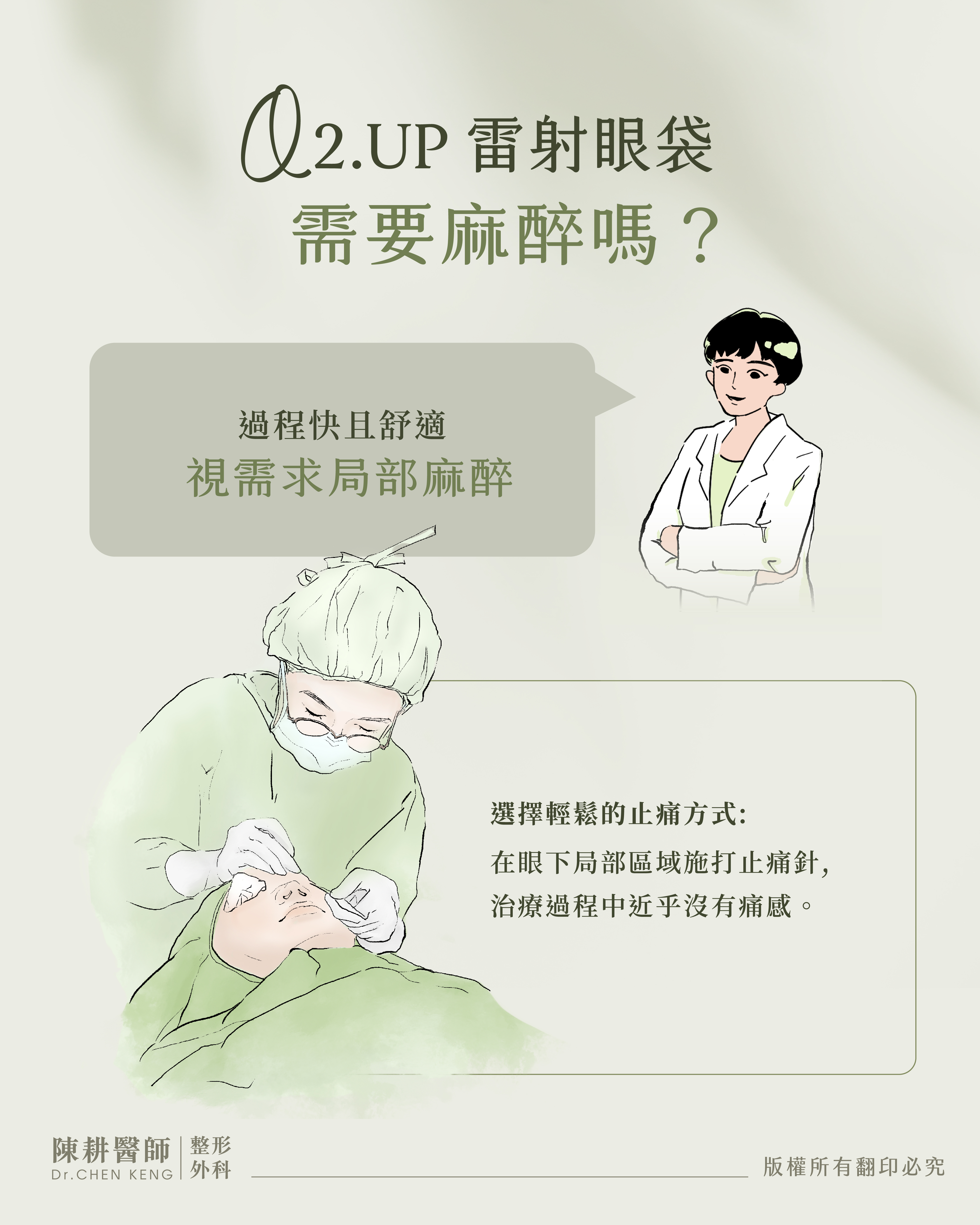 選擇輕鬆止痛的方式:在眼周局部施打止痛針。過程中僅會感到輕微觸碰、拉扯,疼痛感非常低。