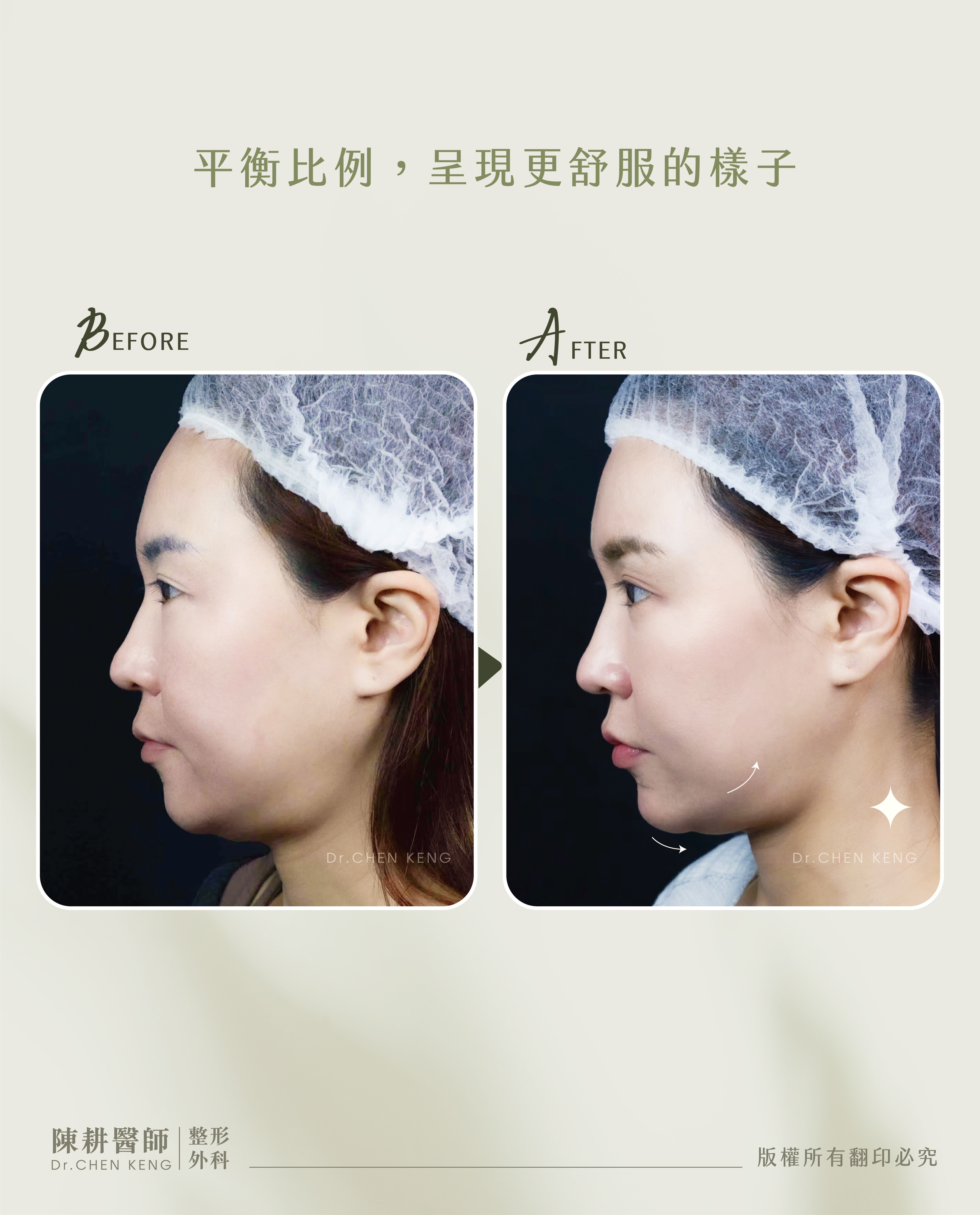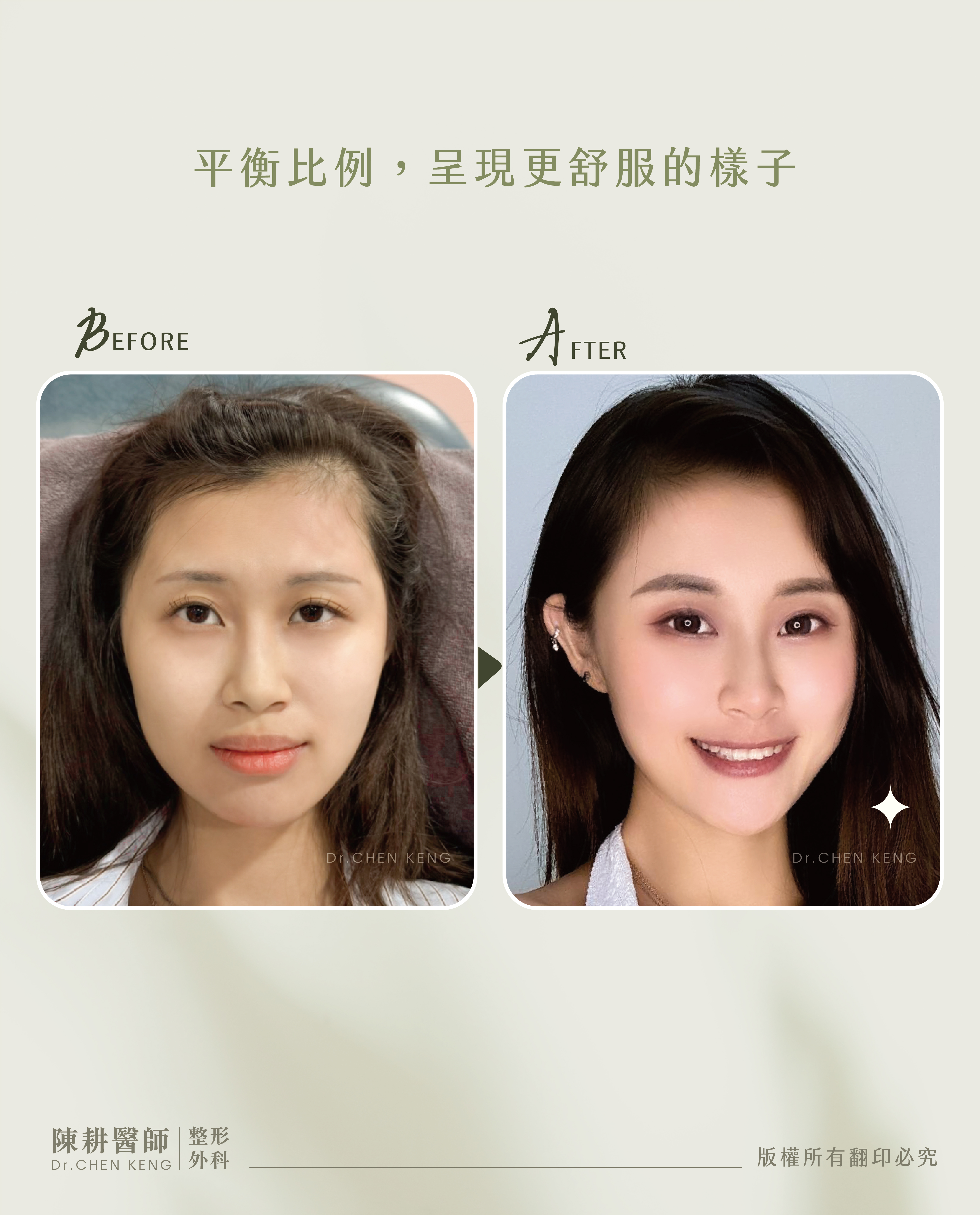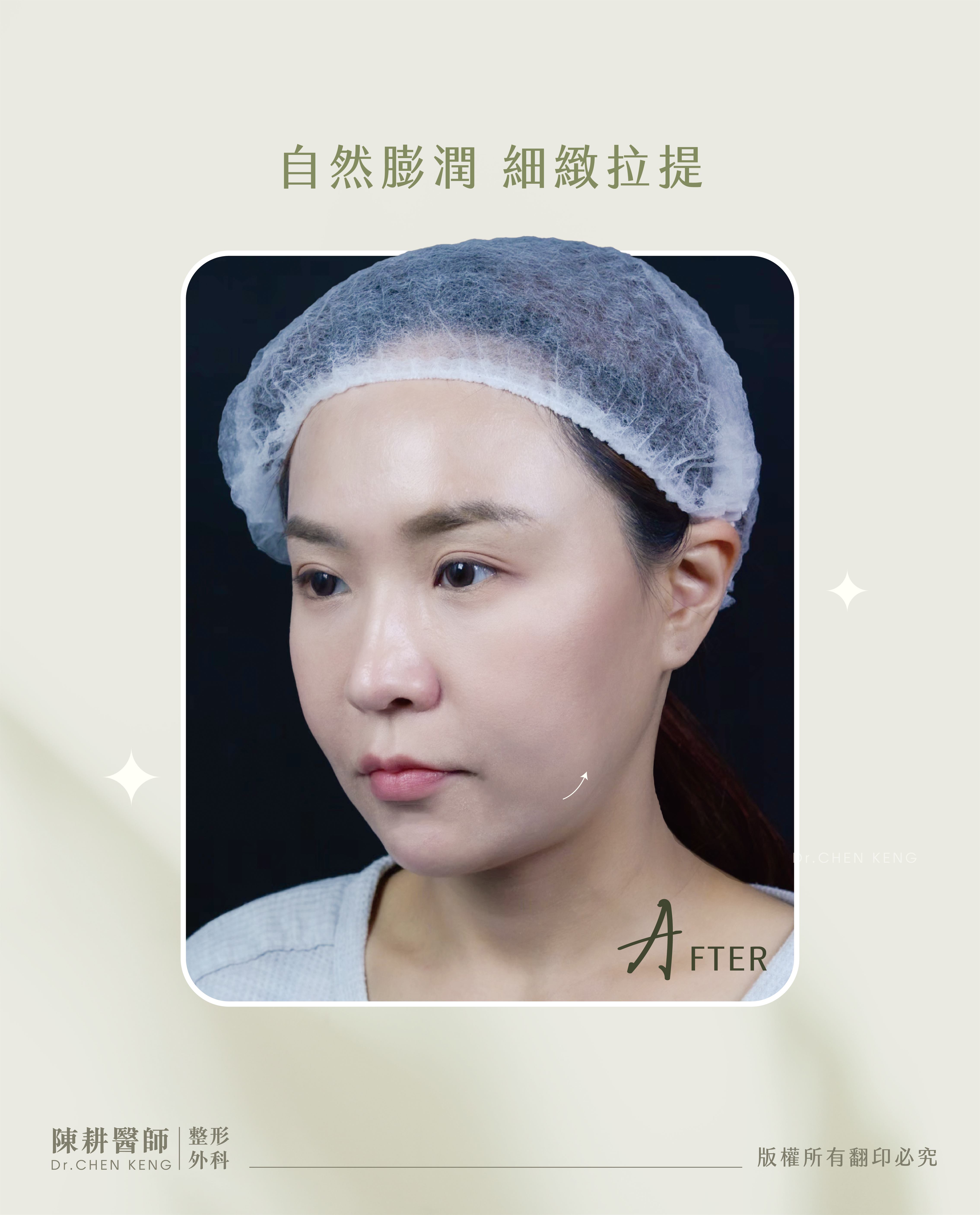 該名案例條件不錯,僅能細緻微調,否則會有明顯的醫美感。透過拉提眉眼與法令紋、木偶紋,讓小臉更顯精緻貴氣。