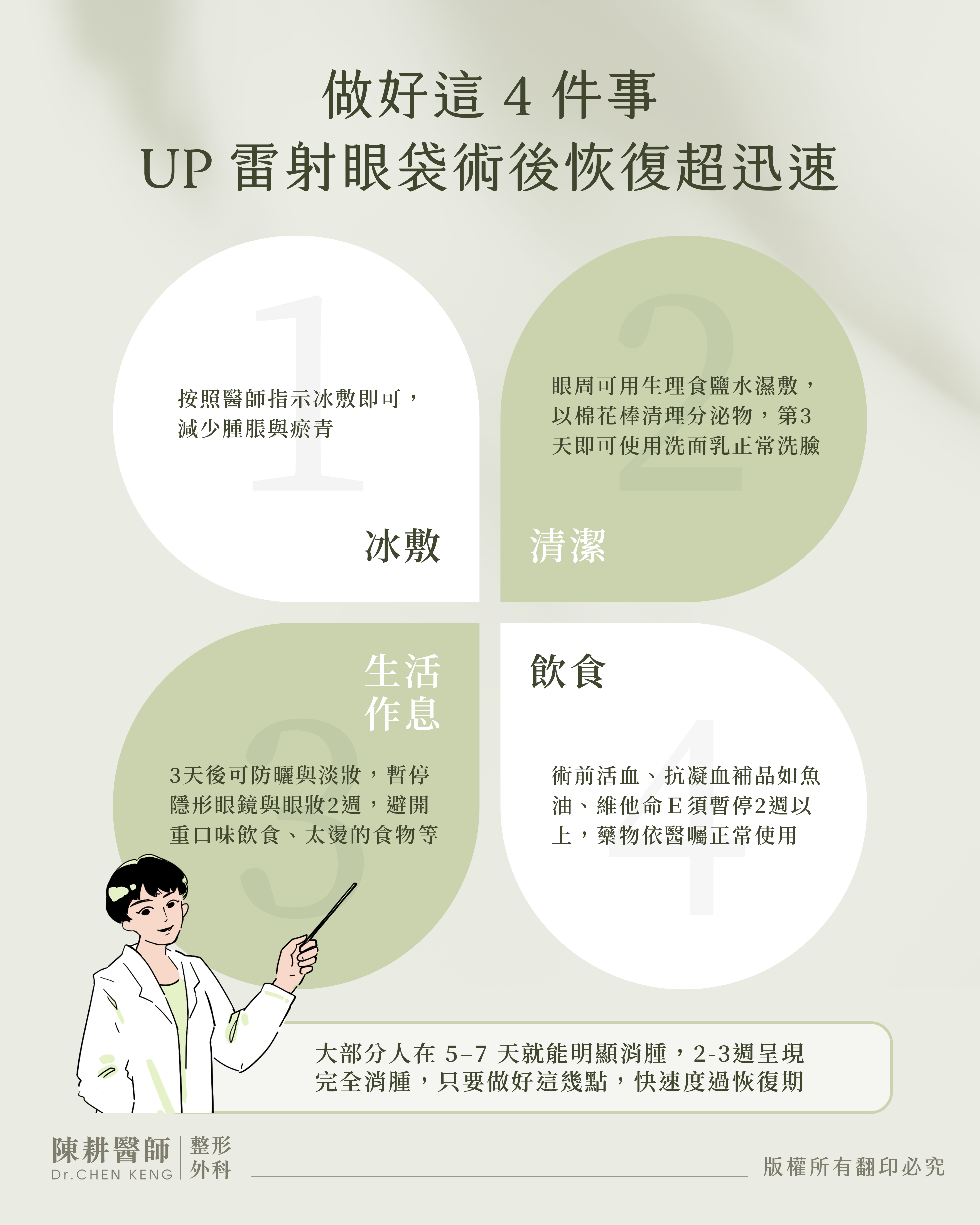 不過,任何療程都有適合的使用情境。UP雷射眼袋雖然優勢多、恢復快,但若眼周皮膚鬆弛,仍需搭配修皮手術才能達到理想中的亮眼成效,也就是需要階段性眼袋手術。
