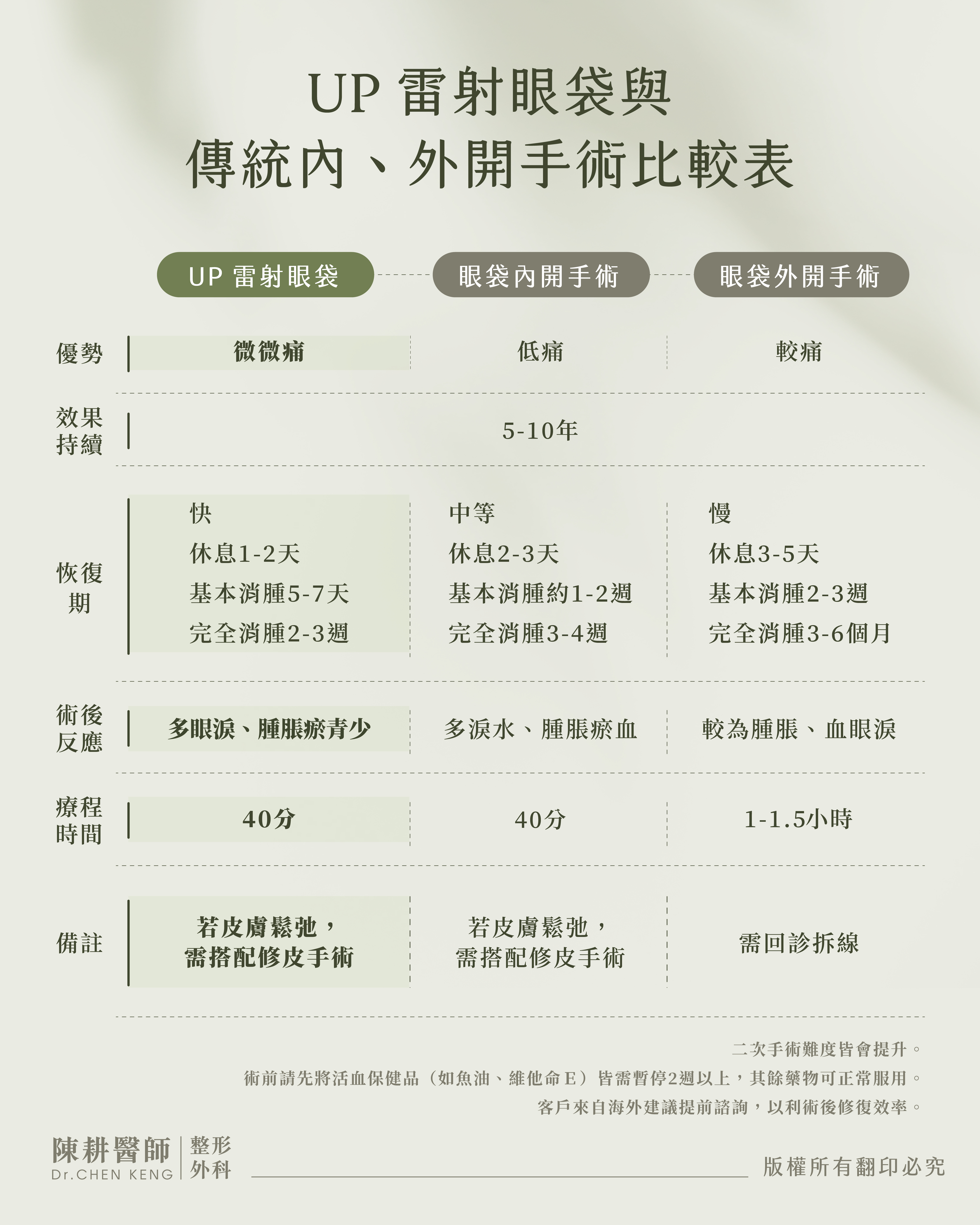 ◆UP雷射vs眼袋內開與外開,一張表看懂